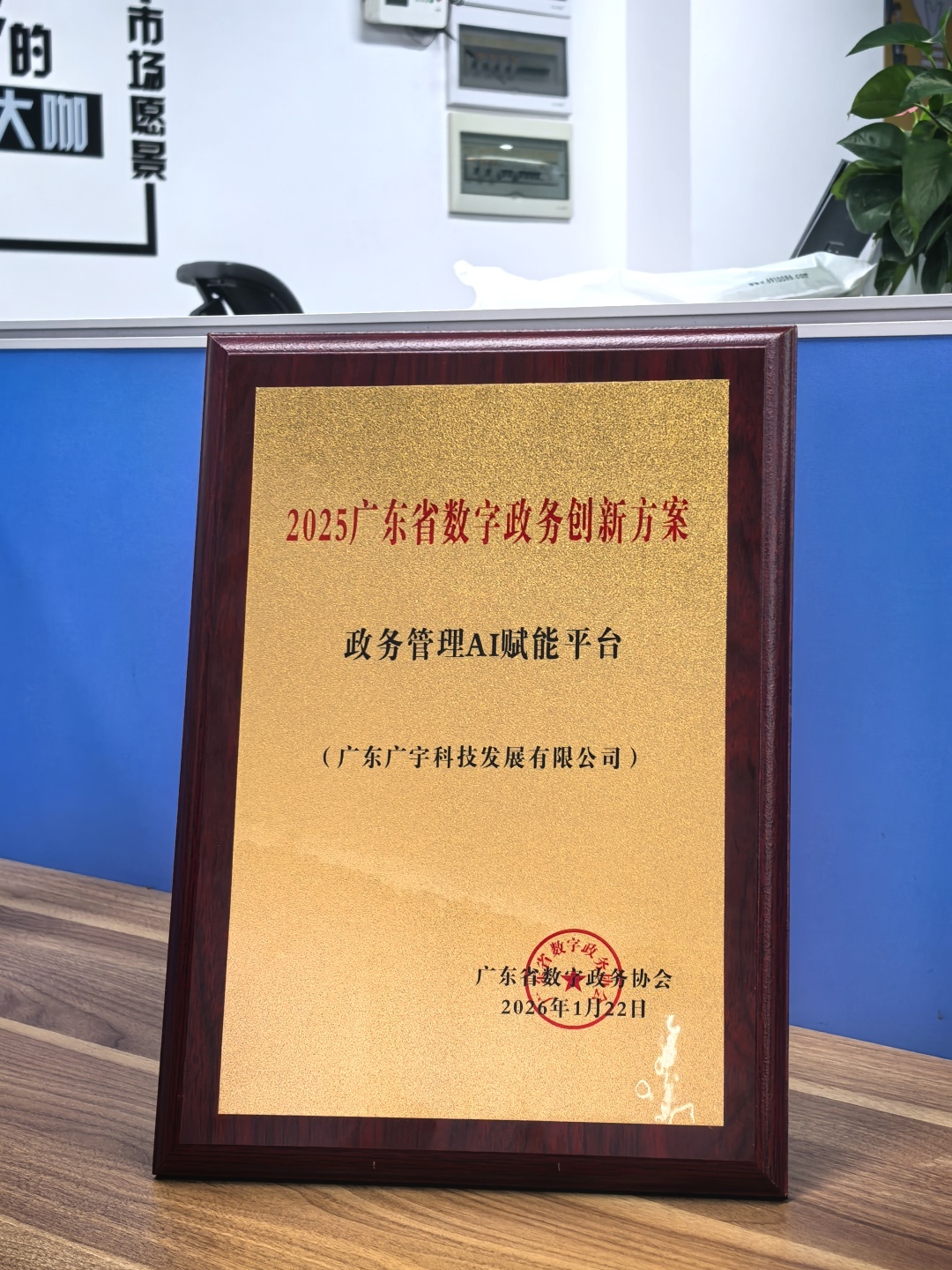 近日,第九届广东数字政务发展论坛在广州举办。广宇科技的“政务管理AI赋能平台”凭借其创新性、场景适配性和应用实效性,成功入选“2025广东省政务服务创新解决方案”。
