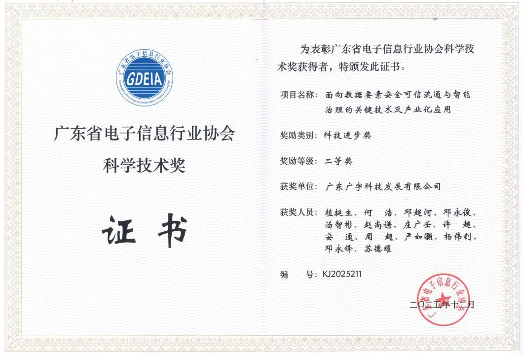 近日,广东省电子信息产业发展大会圆满召开。会上,广宇科技凭借《面向数据要素安全可信流通与智能治理的关键技术及产业化应用》项目,荣获广东省电子信息行业协会科学技术奖二等奖。